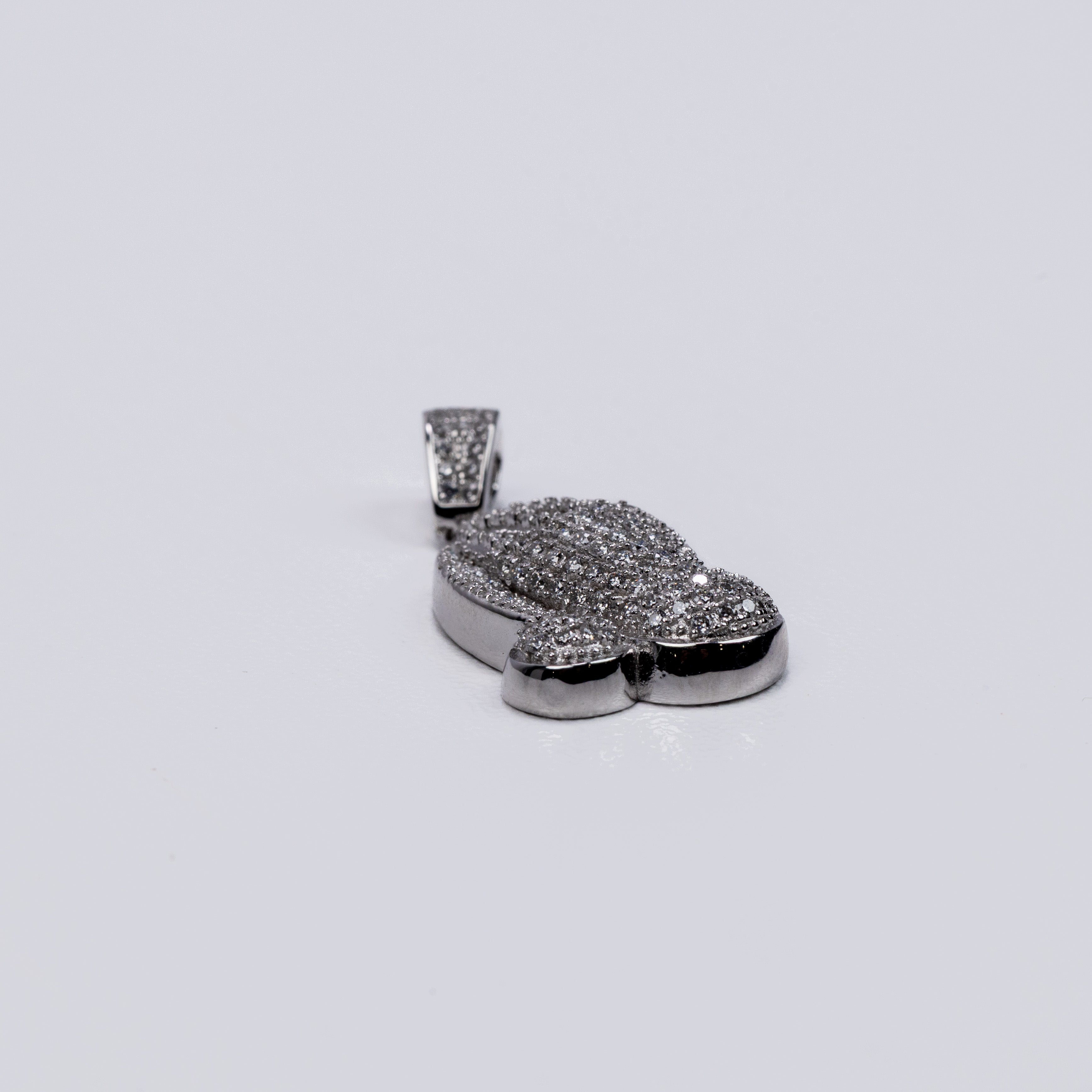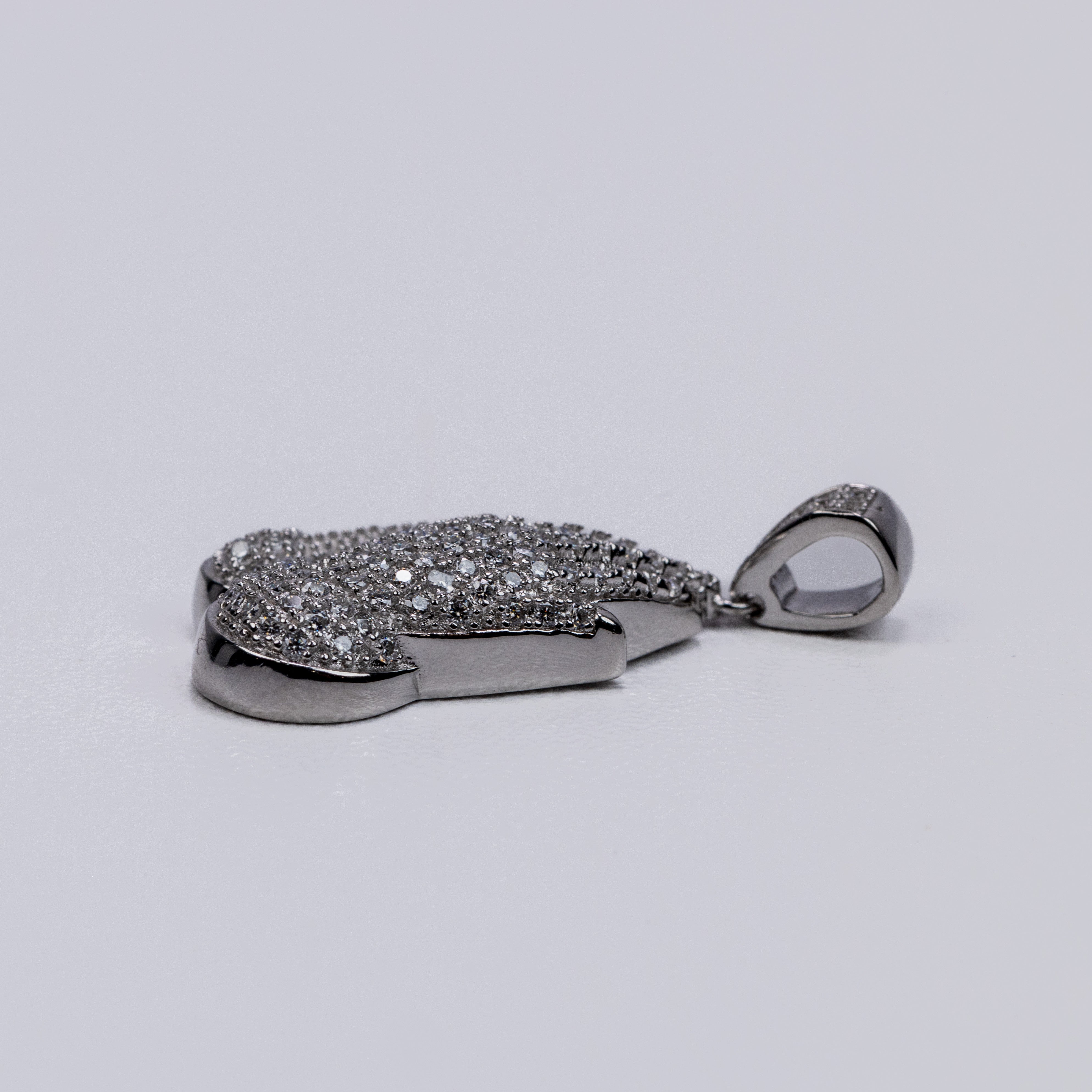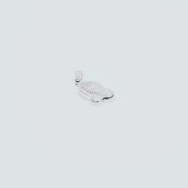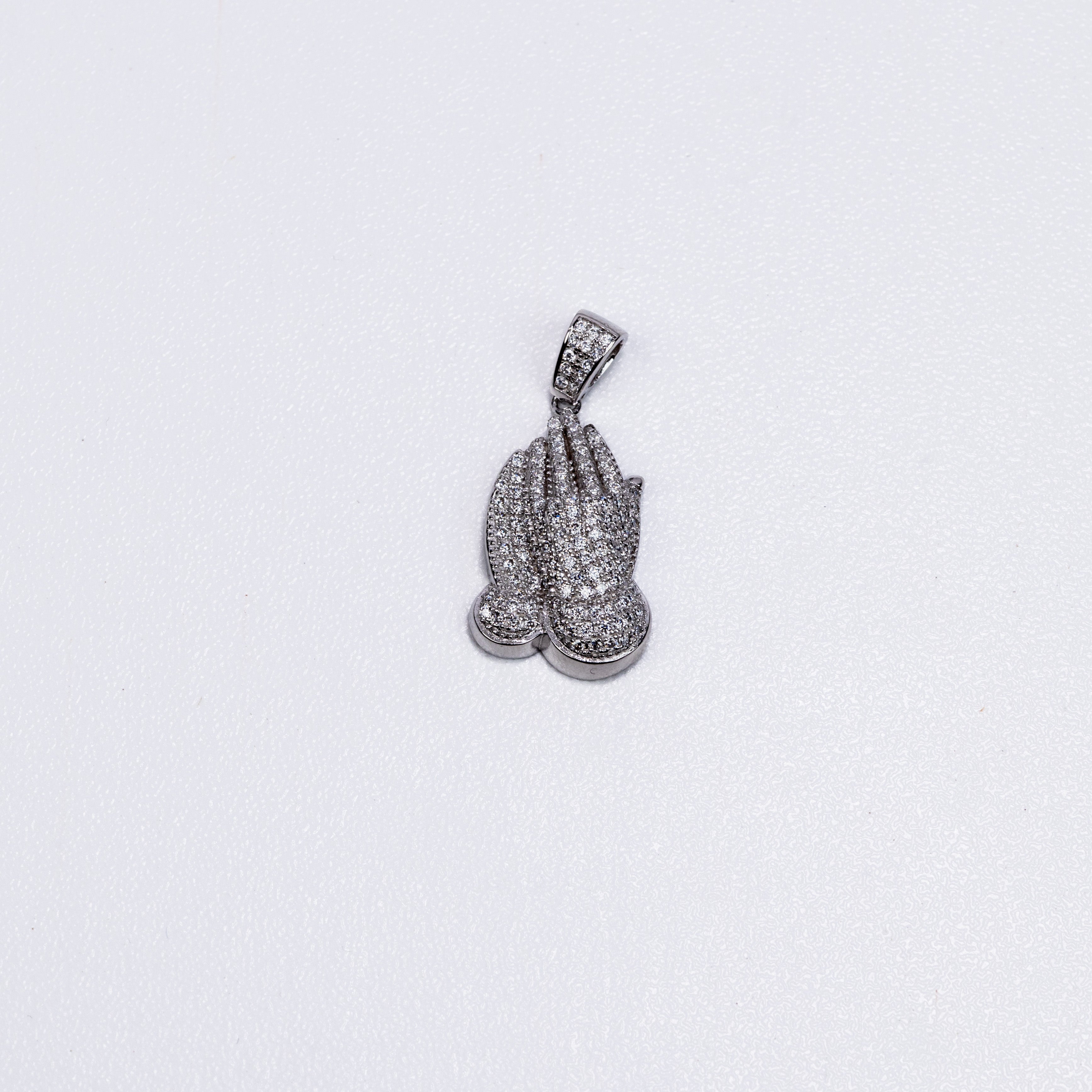 Crafted in a polished silver-tone finish, this pendant features a pair of intricately sculpted praying hands, fully encrusted with shimmering stones that catch the light from every angle. Each curve and contour is finely detailed, giving the piece depth, texture, and a sense of reverence.