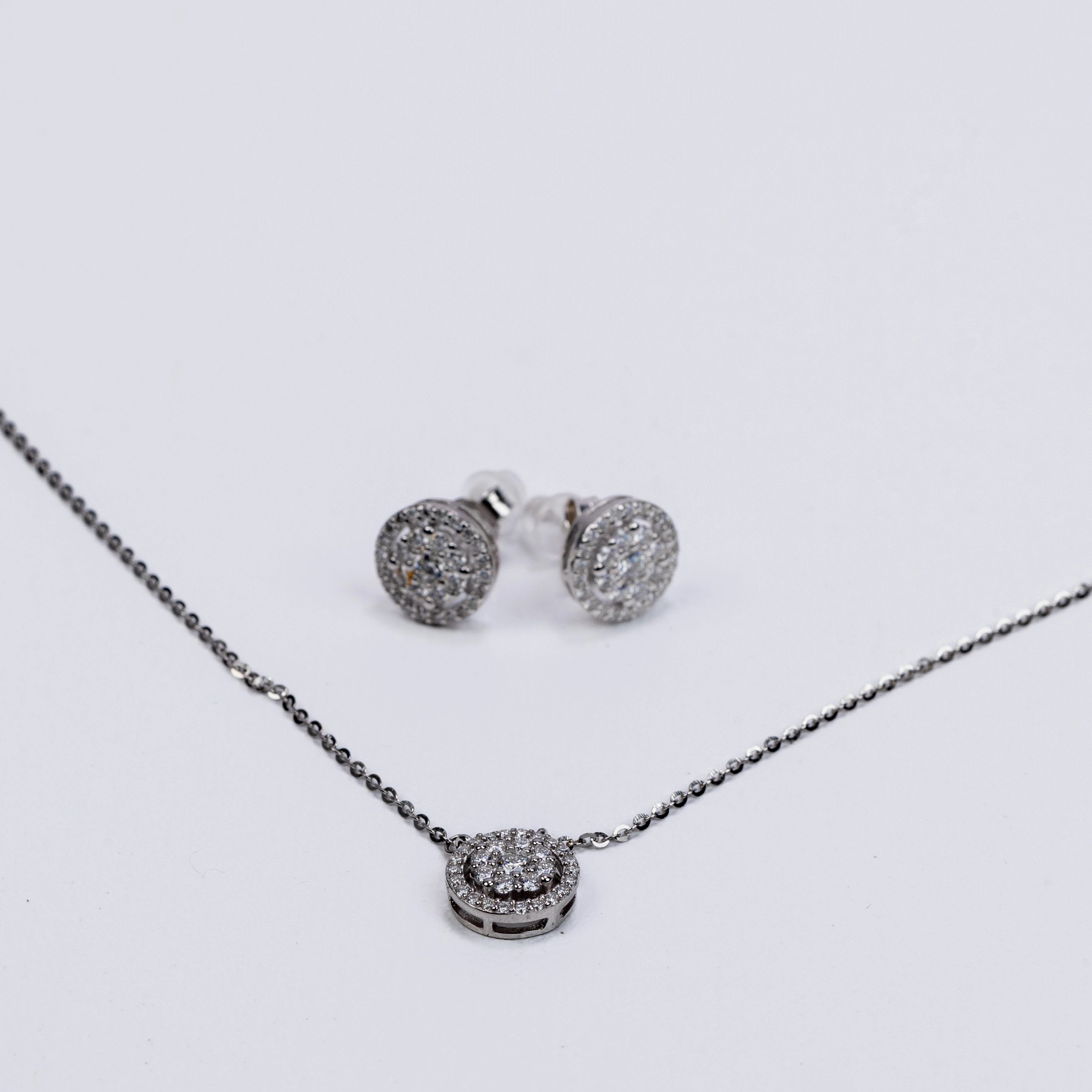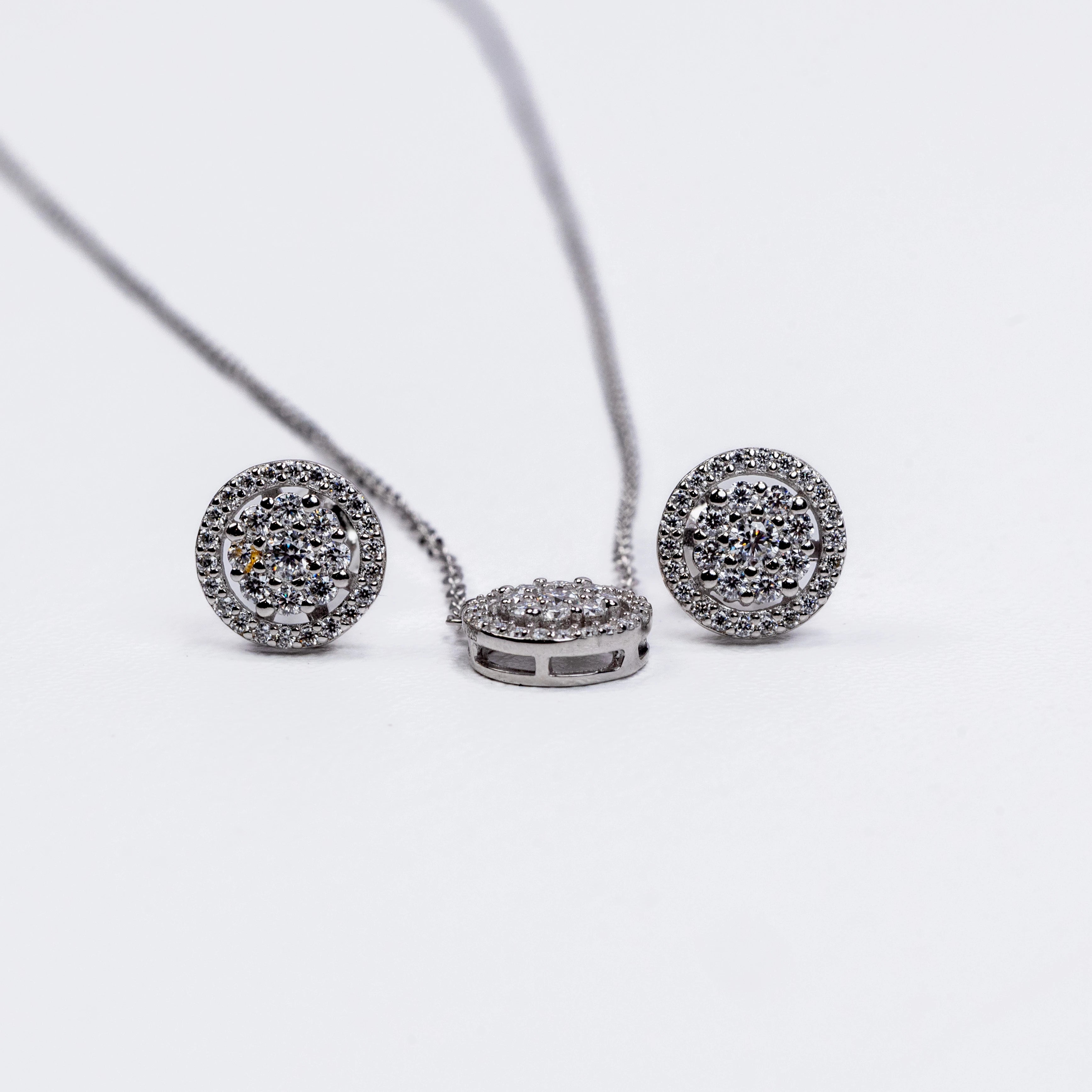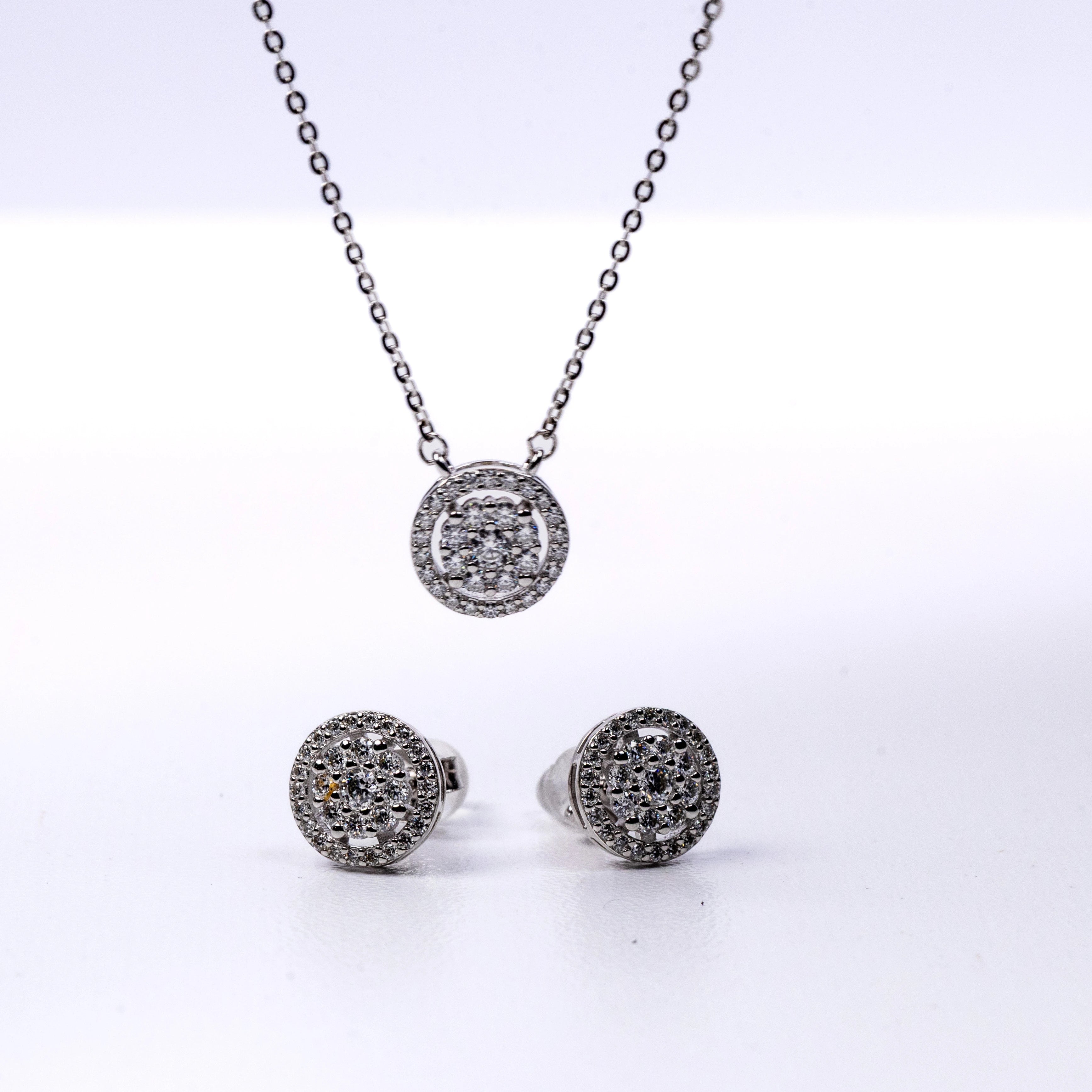 Each piece showcases a cluster-style center surrounded by a shimmering pavé halo, creating exceptional sparkle from every angle. The sleek white-gold–tone finish adds a modern touch, while the classic circular design ensures effortless versatility—perfect for both daily wear and special occasions.
