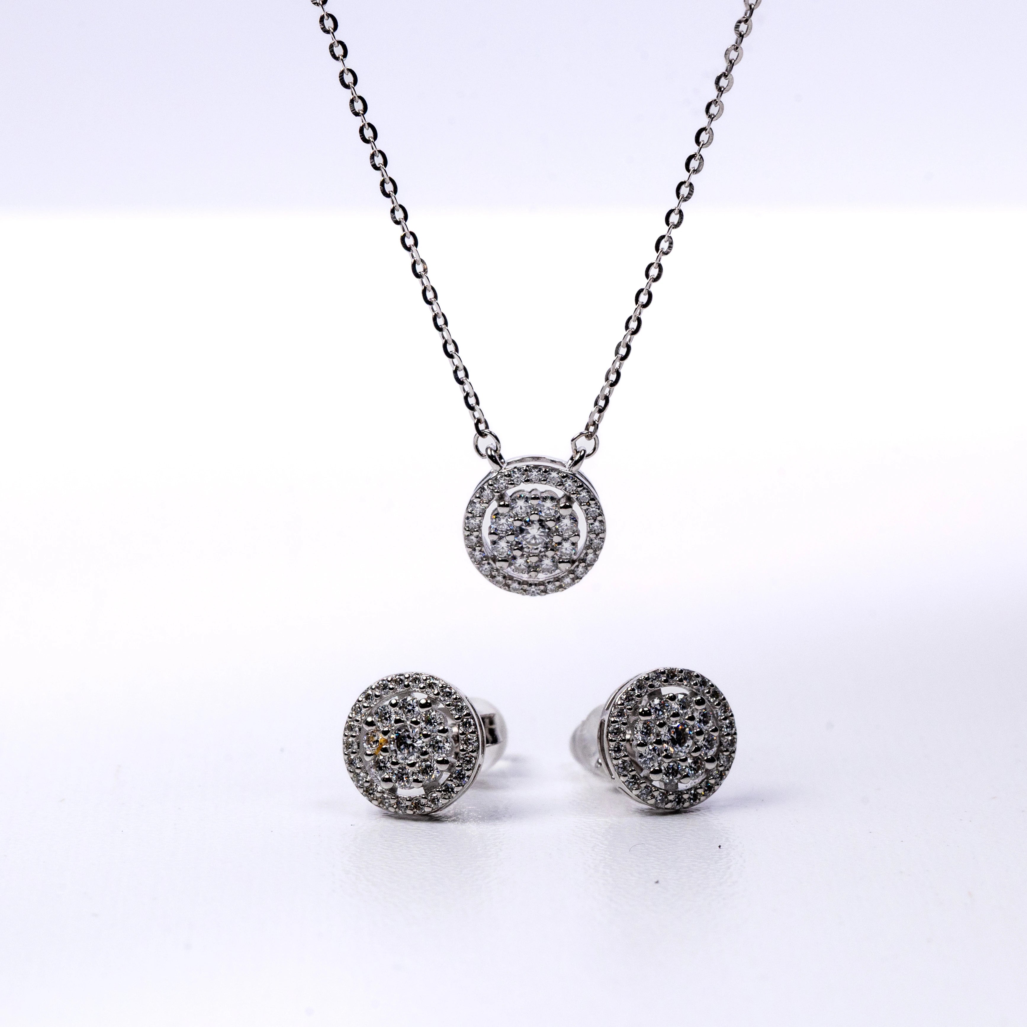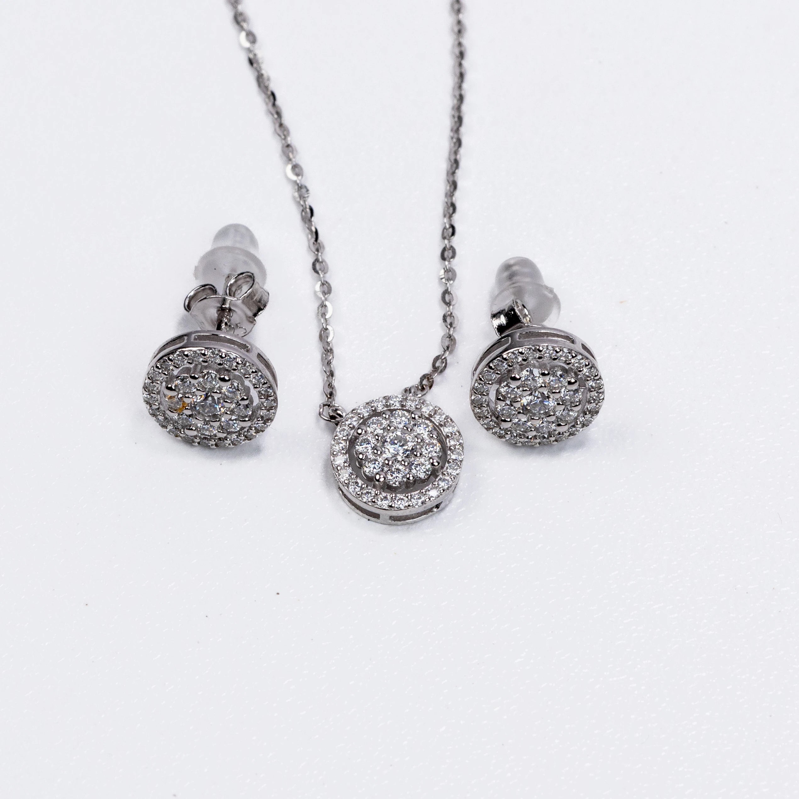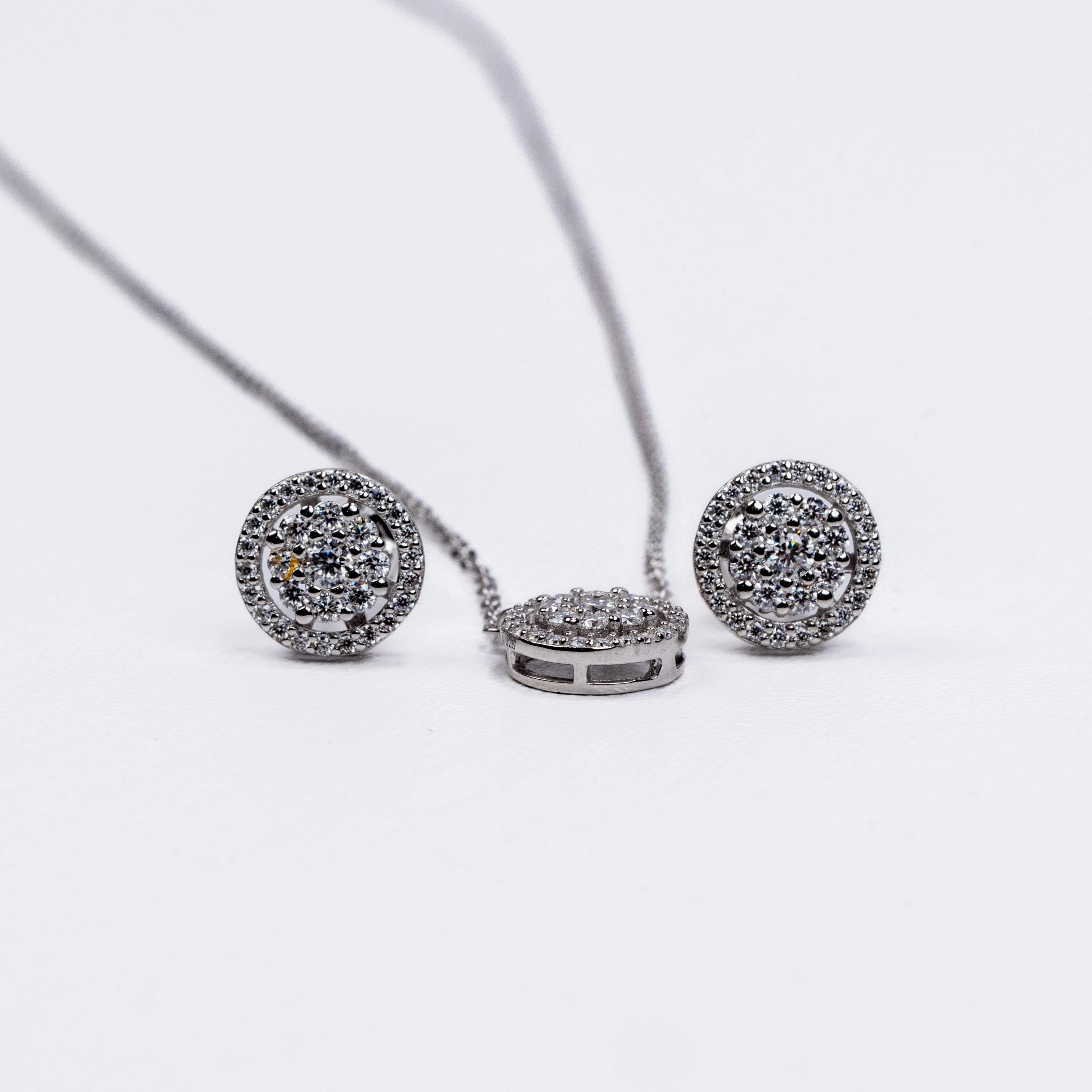 Each piece showcases a cluster-style center surrounded by a shimmering pavé halo, creating exceptional sparkle from every angle. The sleek white-gold–tone finish adds a modern touch, while the classic circular design ensures effortless versatility—perfect for both daily wear and special occasions.