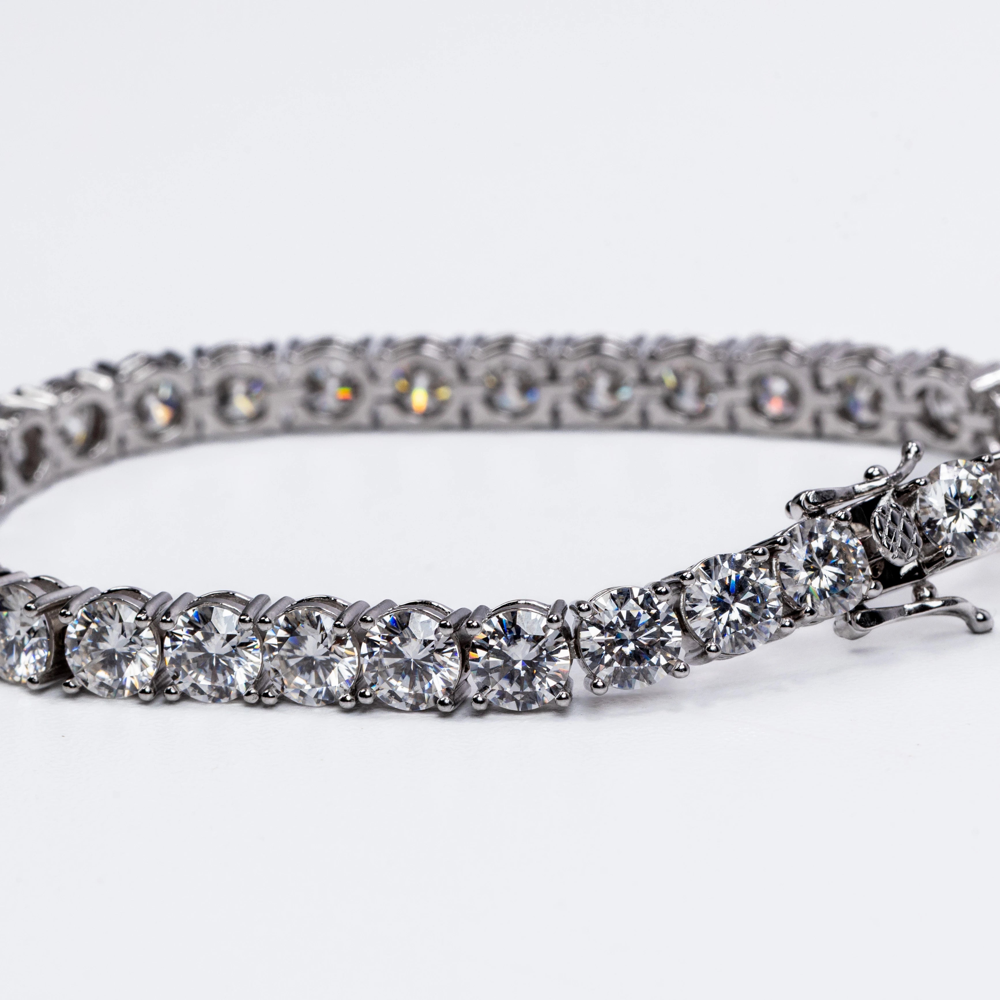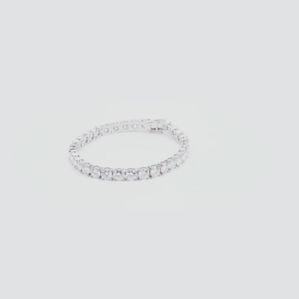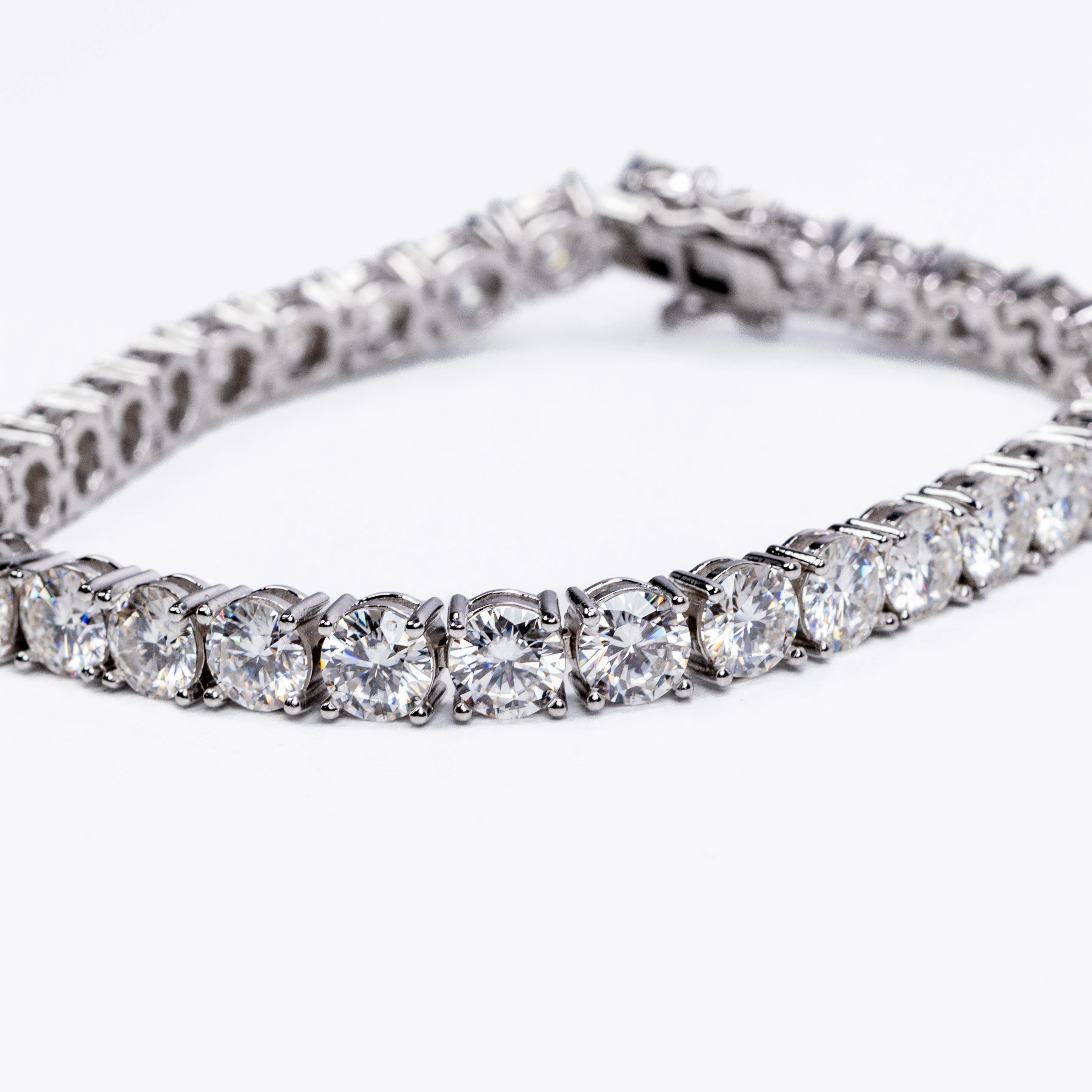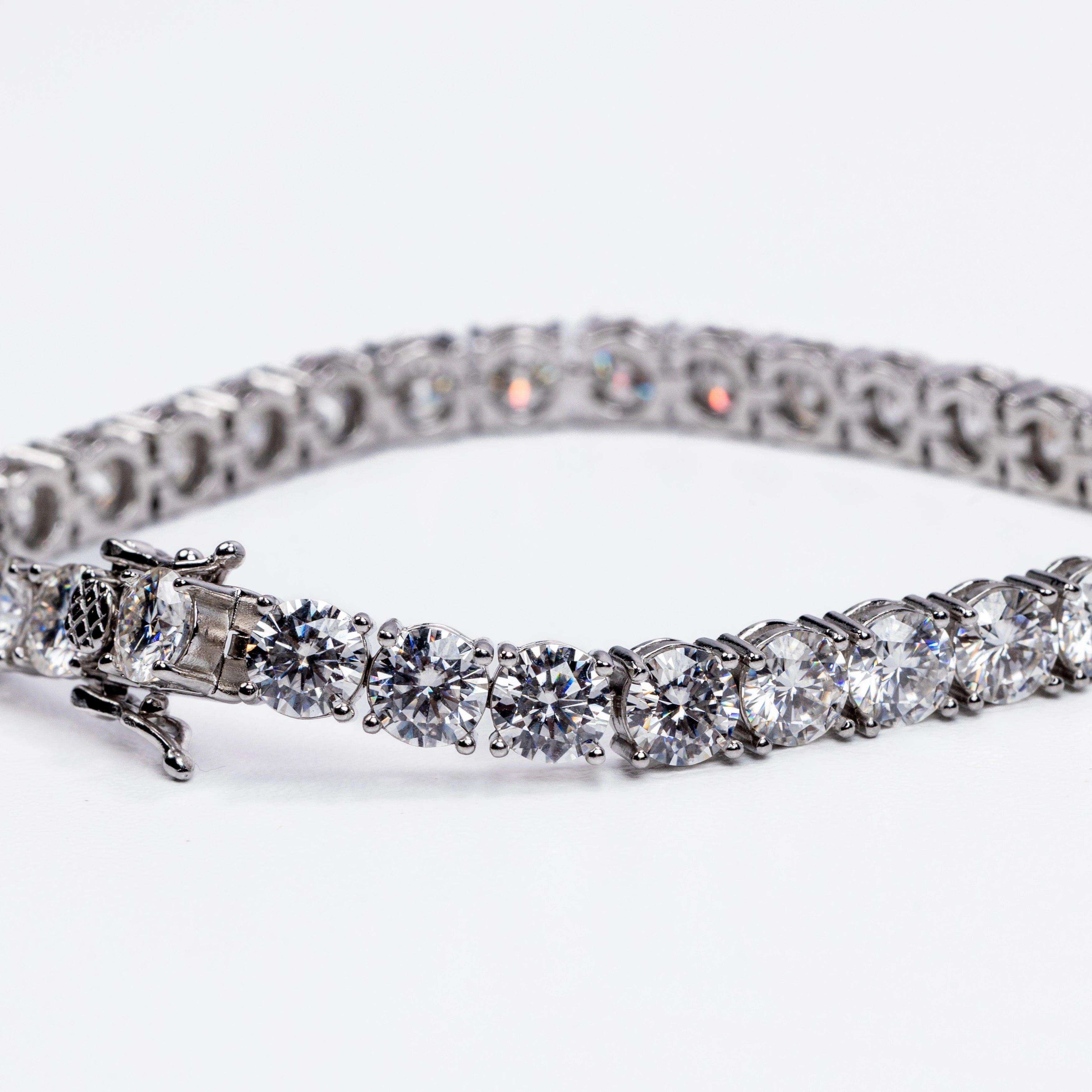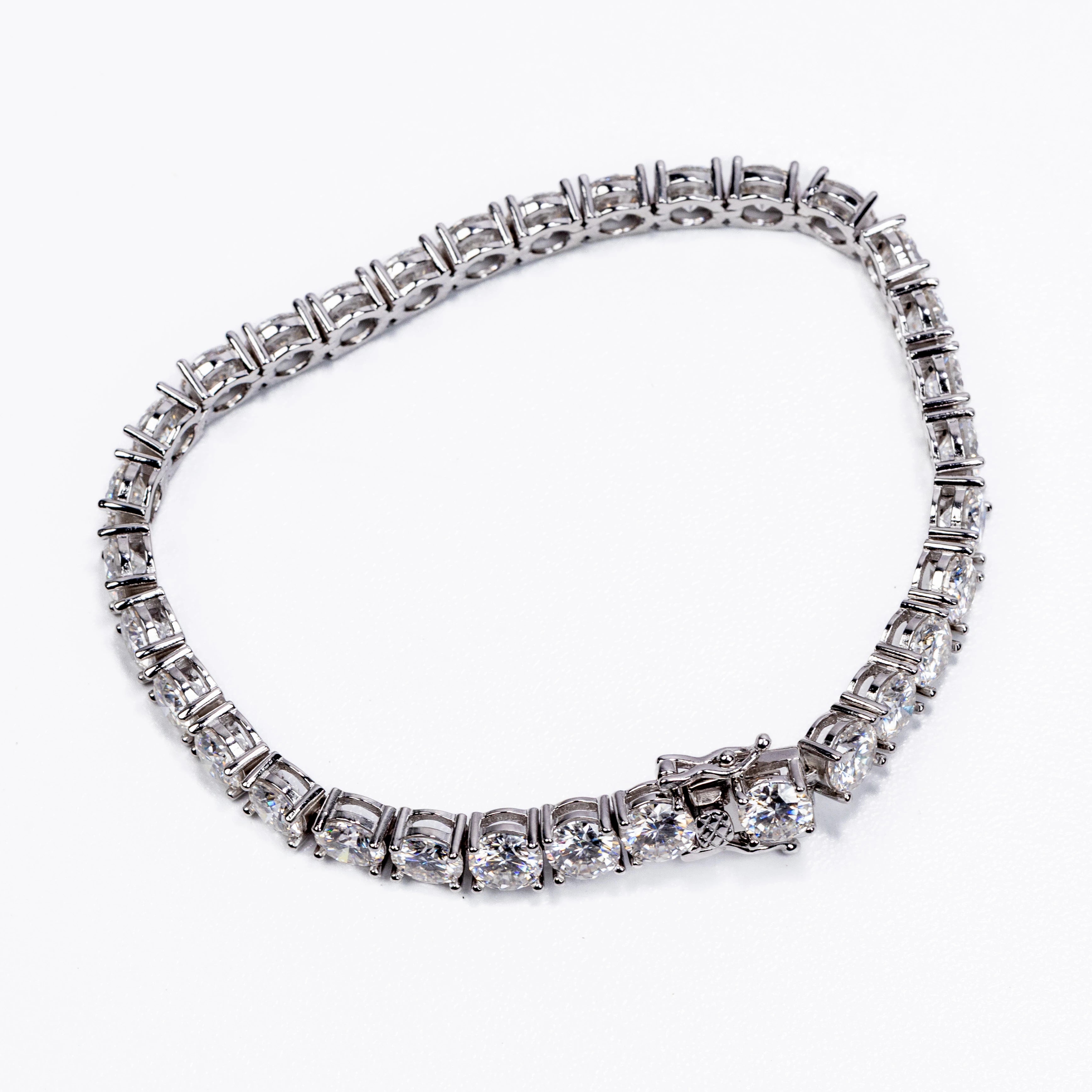 This stunning bracelet features a continuous row of brilliant round-cut stones, each meticulously set in a secure four-prong setting to maximize sparkle and clarity. The sleek, polished metal links create a fluid, flexible design that contours beautifully around the wrist, offering both durability and exceptional comfort.
