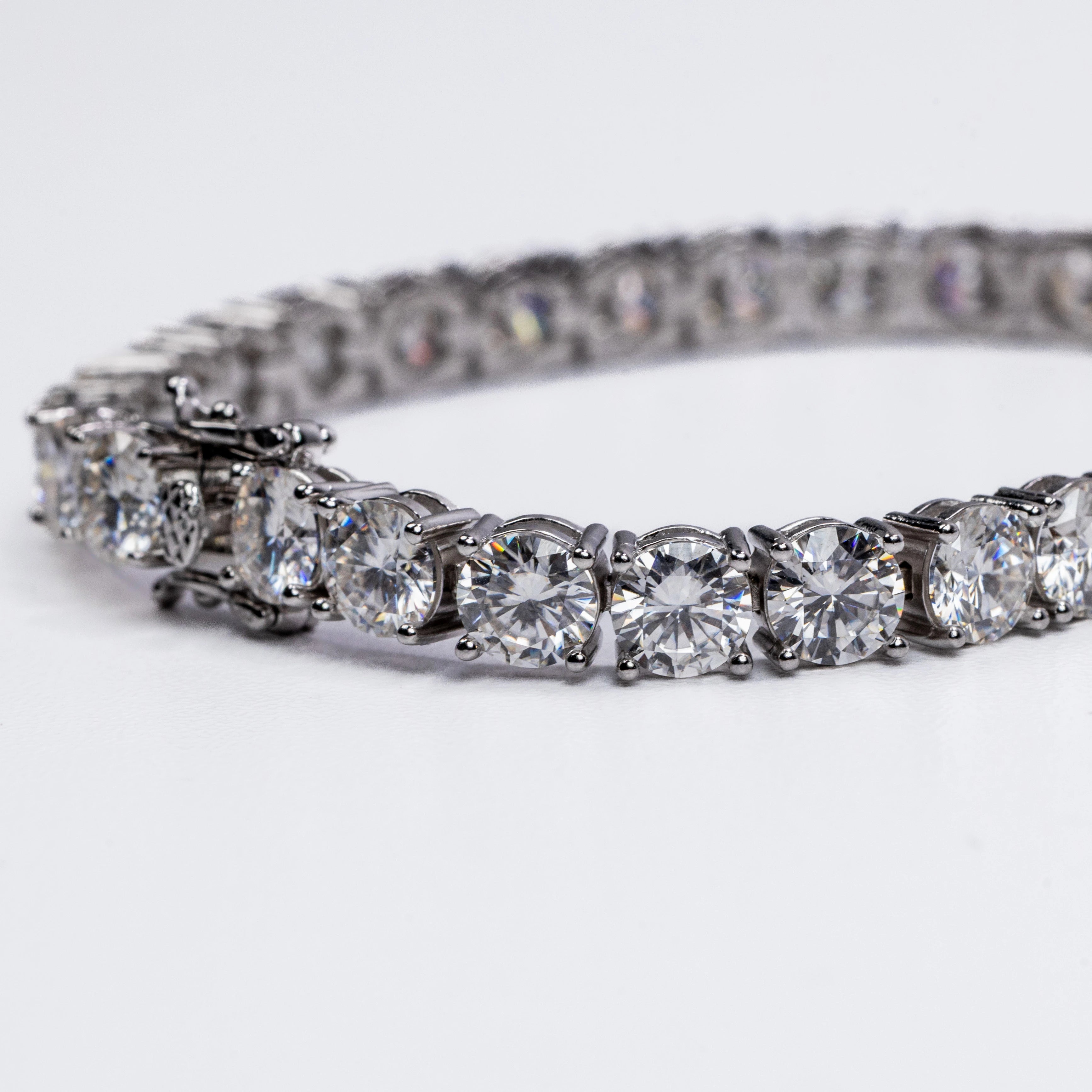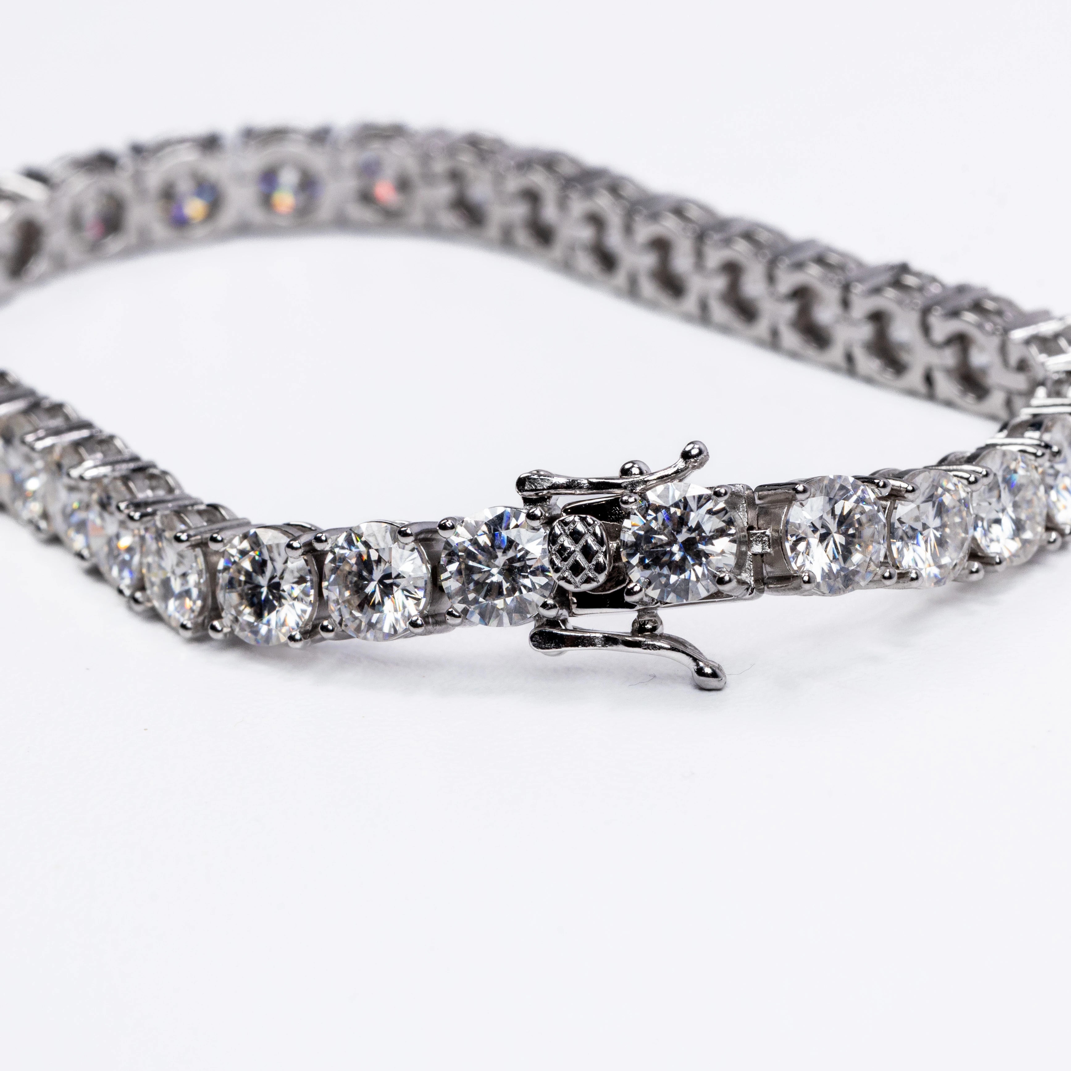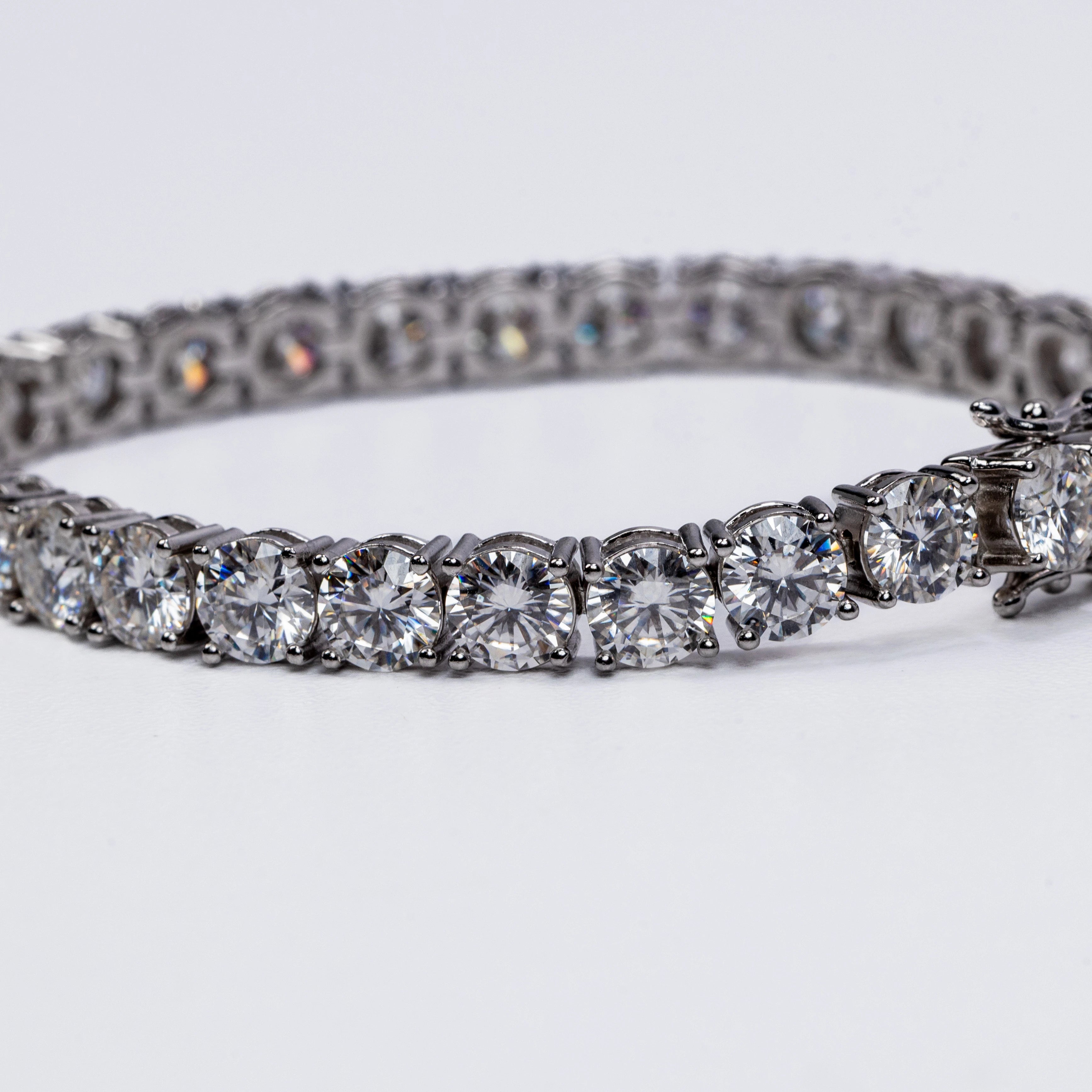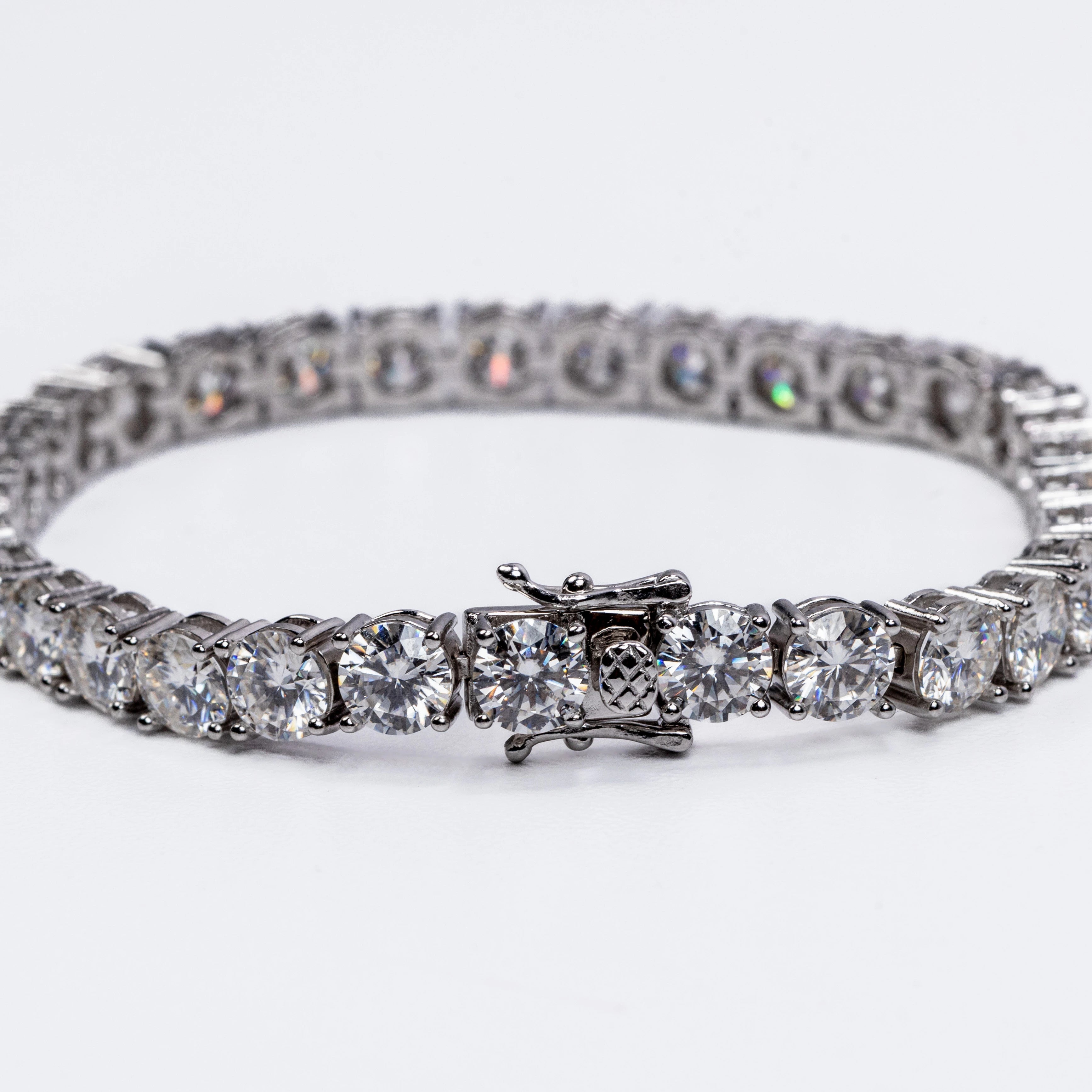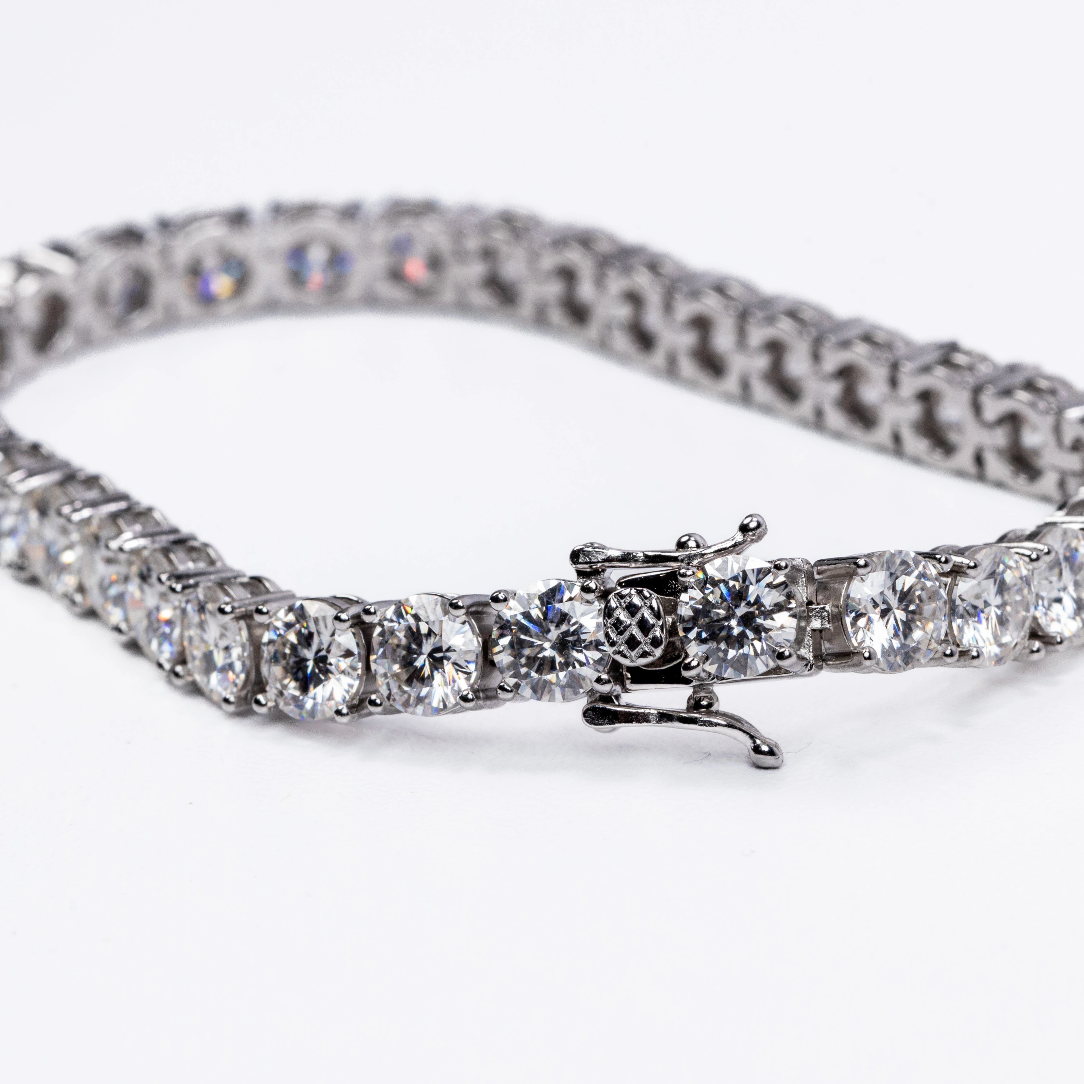 This stunning bracelet features a continuous row of brilliant round-cut stones, each meticulously set in a secure four-prong setting to maximize sparkle and clarity. The sleek, polished metal links create a fluid, flexible design that contours beautifully around the wrist, offering both durability and exceptional comfort.