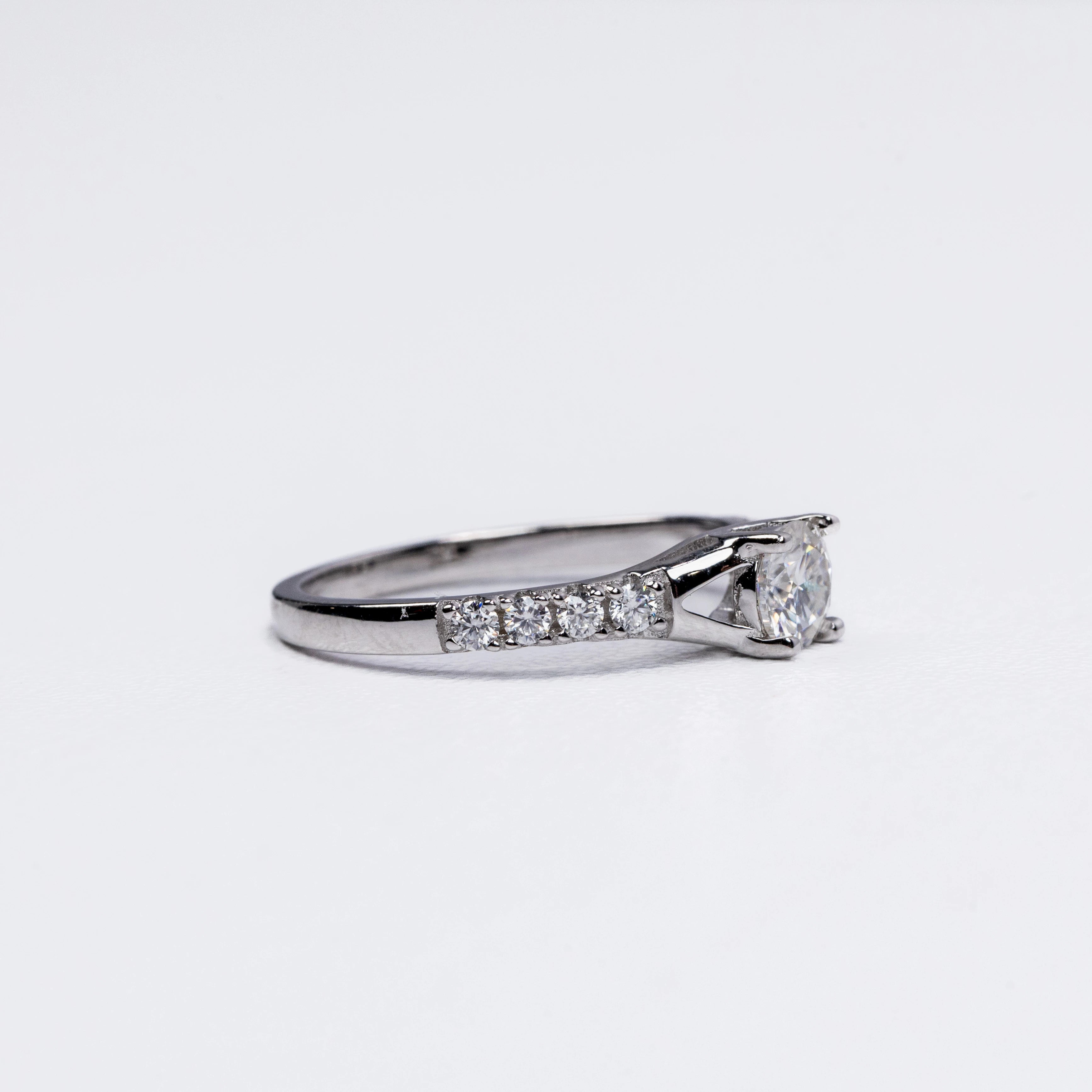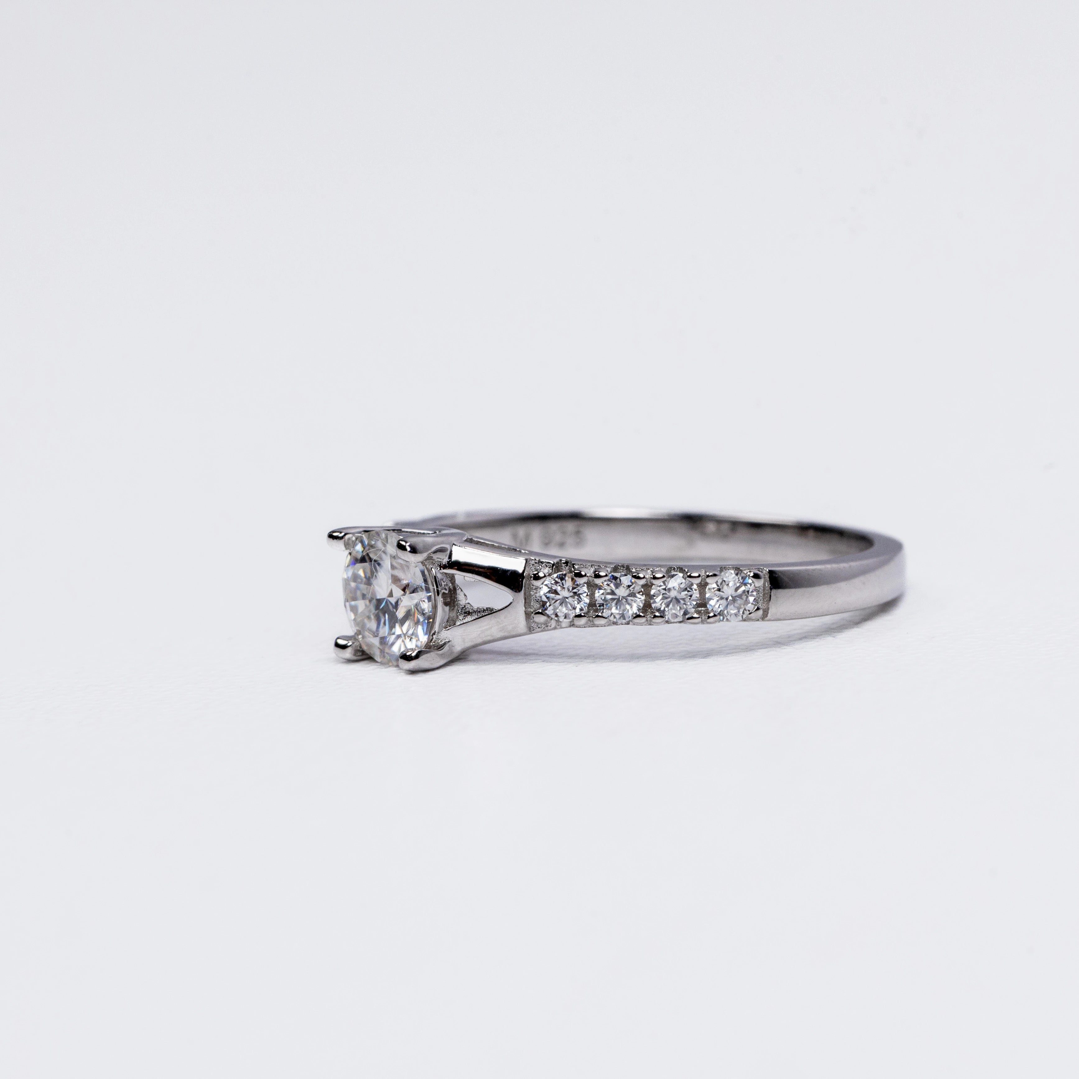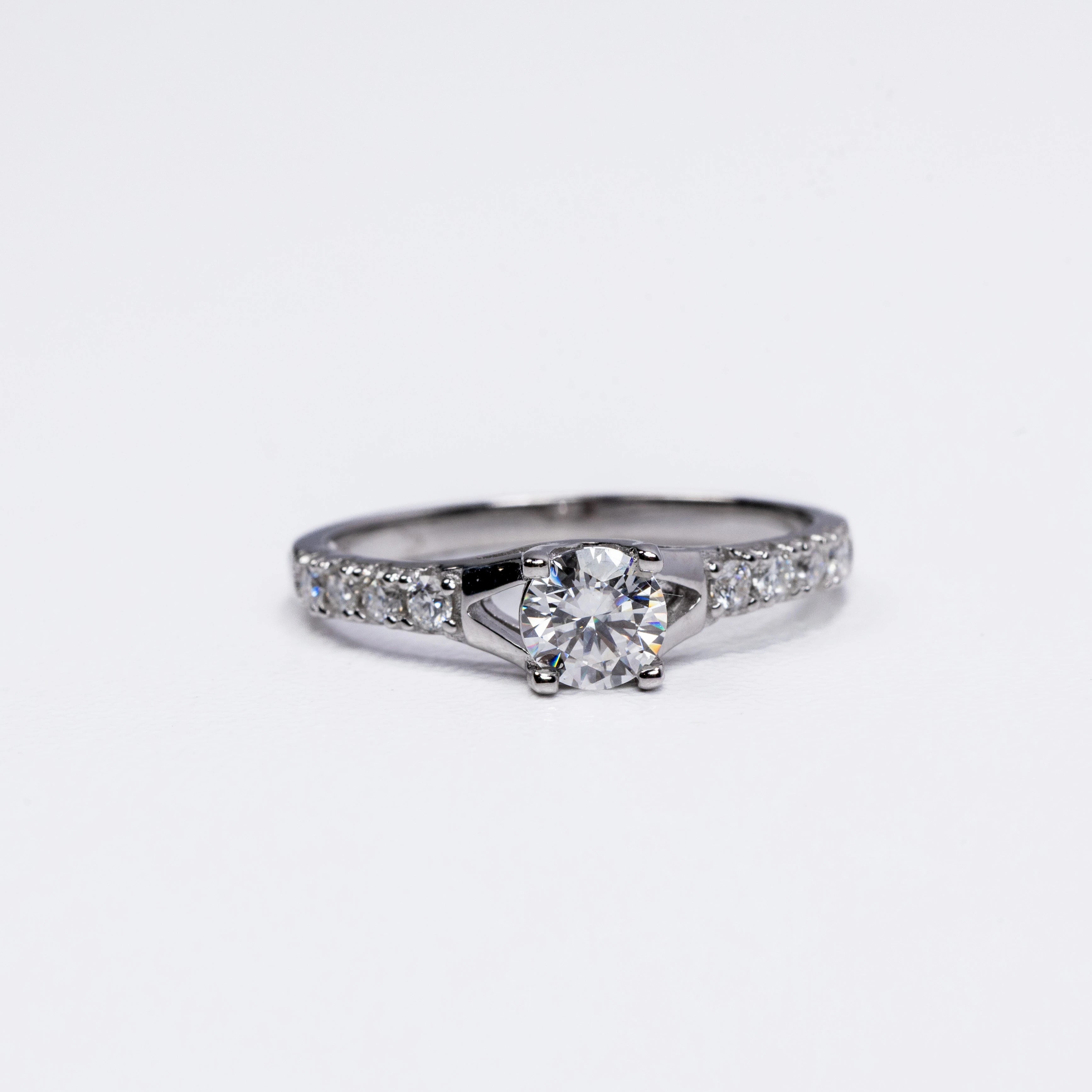 The classic and timeless design, with the center stone highlighted as the focal point while the side stones enhance brilliance without overpowering it. It’s a style commonly used for engagement rings due to its elegance and balanced proportions.
